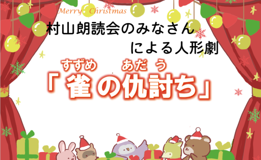 村山朗読会のみなさんによる人形劇「雀の仇討ち」を開催します。ぜひお越しください。人形劇にきてくれた方はおはなしのへやポイ...