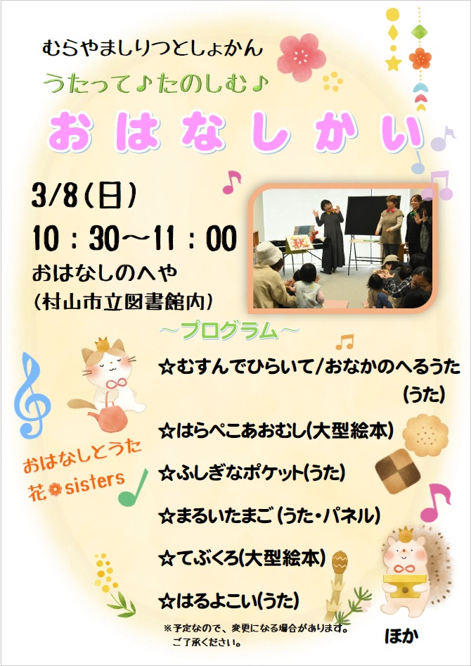 3/8のおはなしのへやは、えほんだけではなく歌とダンスも楽しめるおはなし会です。ぜひお越しください。 日時 開催日 3月8日(日)時 間 10:30~11:00場 所 おはなしのへや(村山市立図書館内)