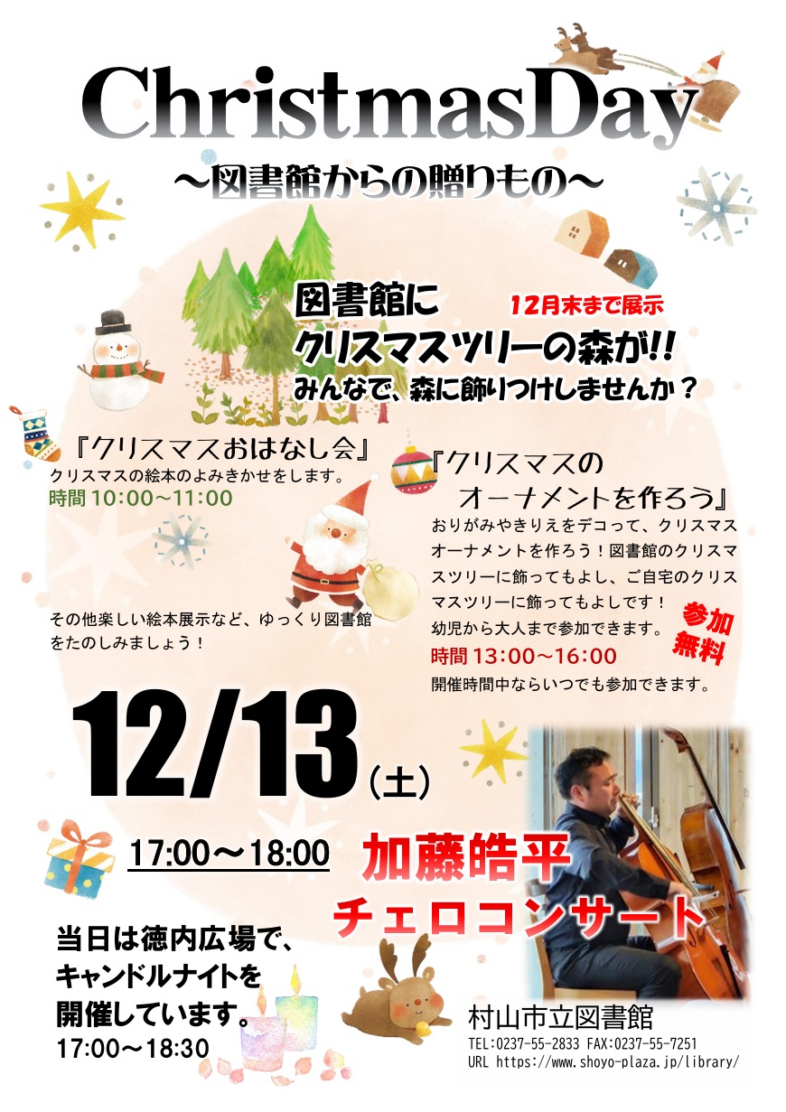 館内にて、加藤皓平さんのチェロコンサートやオーナメントづくり、クリスマスおはなし会を行います。ぜひご来館ください。